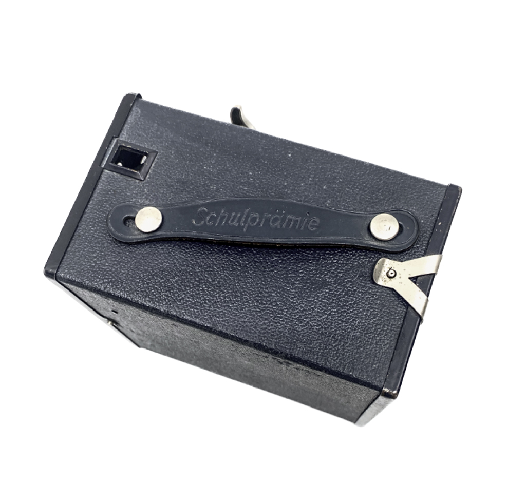 La cámara es de un elegante color azul y en el asa lleva impreso el nombre Schulpramie lo que la hace inconfundible. Era un aparato muy sencillo de bajo presupuesto, pero que seguro que llenaría de orgullo a quienes la recibieron y fomentaría su interés por la fotografía.
